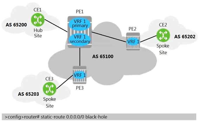 To enable full spoke-to-spoke connectivity for the CE hub and spoke VPRN, on which router(s) should the displayed static-route be configured?