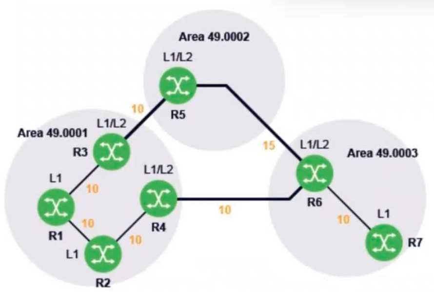 In the diagram, all routers are using IS-IS as their routing protocol. The number next to each link is its