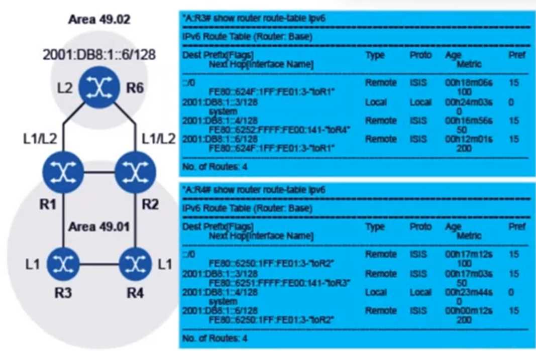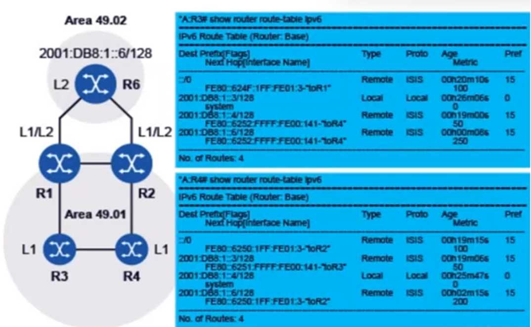 All routers are running IS-IS with IPv6 support enabled. Based on the topology shown, and the route