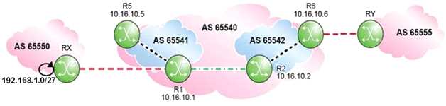 preference of 200. Router R3 advertises the prefix 192.168.1.0/27 to routers R5 and R6.