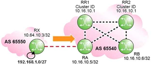 Routers RR1 and RR2 are route reflectors with the same Cluster-ID. How does router RA treat the