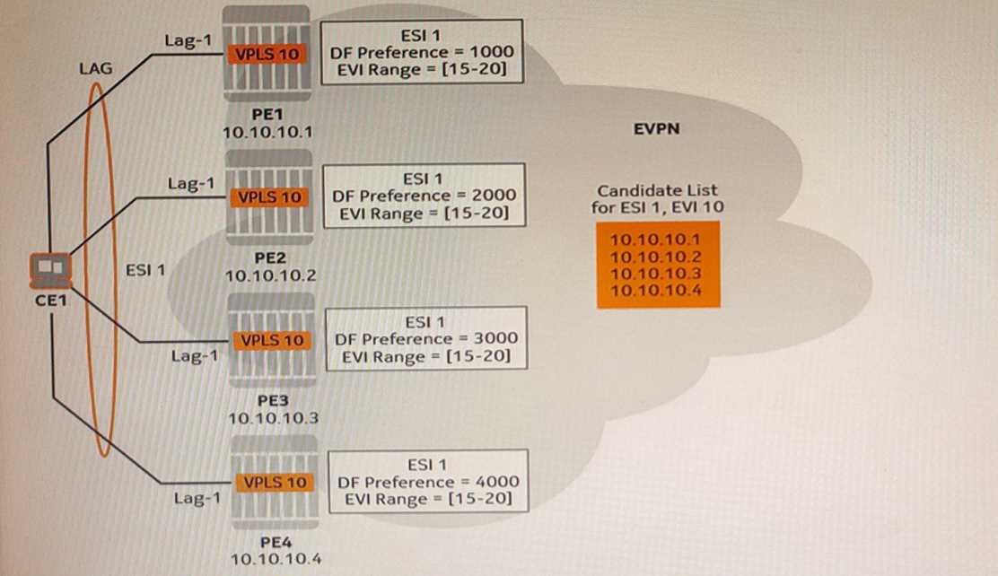 designated forwarder (DF) on ESI 1. Which PE is elected as DF for VPLS 10?