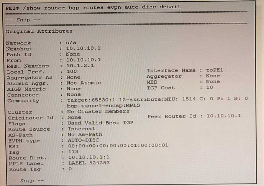 In the exhibit, PE2 is receiving an EVPN auto-discovery (A-D) route from PEI. Based on the output,