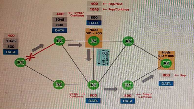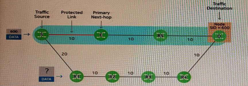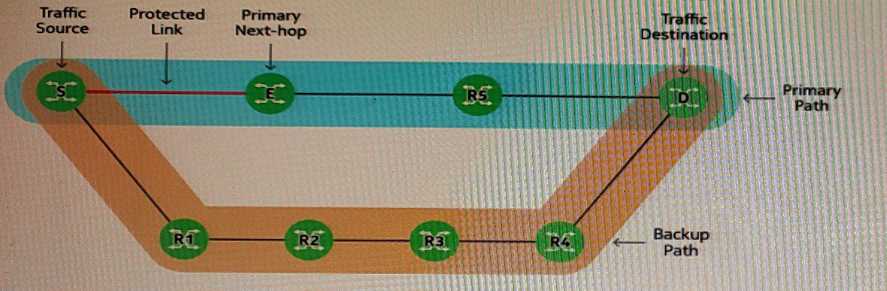 exhibit also shows a backup path. The protected link fails and fast re-route is triggered on router S. If