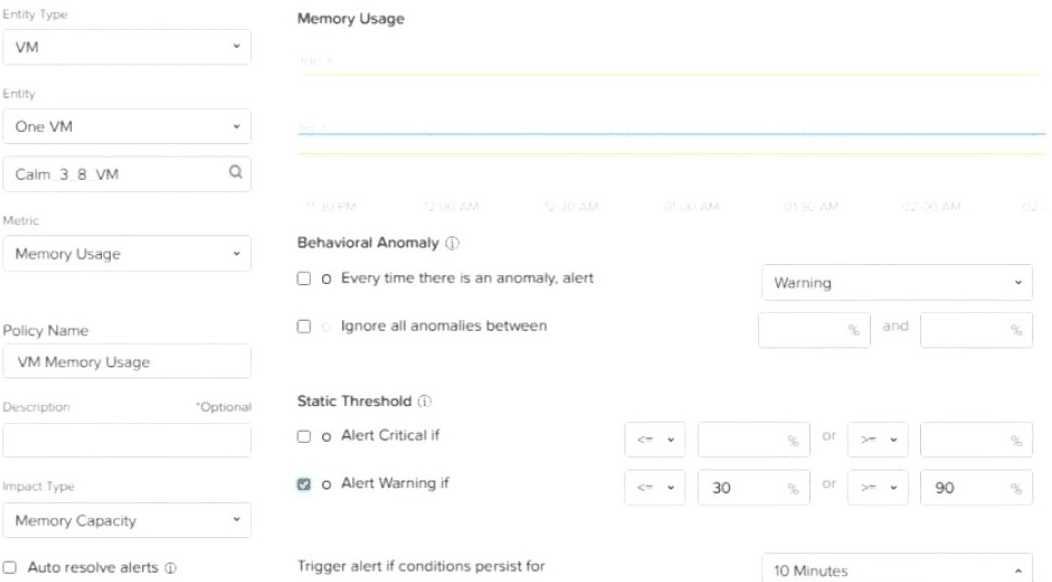 A custom alert policy is configured for a VM named Calm_3_8_VM to generate aWarningalert
