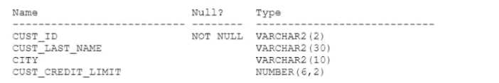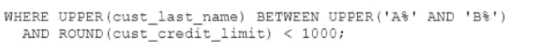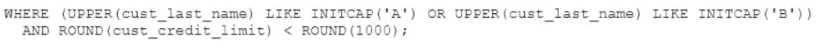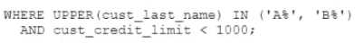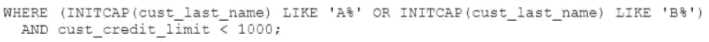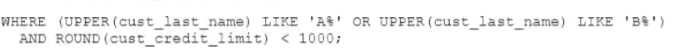 Examine the description of the customers table: You need to display last names and credit limits of all customers whose last name starts with A or B in lower or upper case, and whose credit limit Is below 1000. Examine this partial query: SELECT cust_last_name, cust_credit_limit FROM customers Which two where conditions give the required result? A) B) C) D) E)