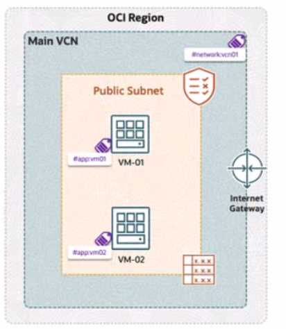 compute instances, VM1-01 and VM-02, in a public subnet. VM-01 is tagged with the security