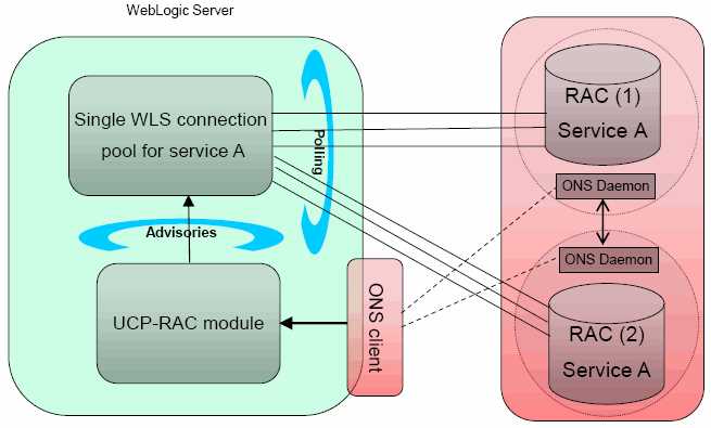 B. depicts a FAN-disabled Data Source between WebLogic Server and an Oracle Database service that includes two RAC nodes
