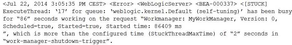 D. If another thread is stuck the error number will be <BEA-000338> in the WebLogic log file.