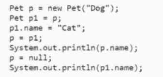 assigns p1 to p. Finally, it sets p to null and prints the name of p and p1. The output will be “Cat” and