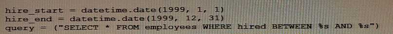 F. d = cursor.fetchall(query, (hire_start, hire_end))