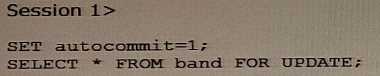 Examine these statements issued from Session 1 which execute successfully: Now, examine these statements issued from Session 2 which execute successfully: Session 2> BEGIN; UPDATE band SET song=CONCAT ("Here Comes the ", song) WHERE song LIKE ' %Sun ; Which two are true?