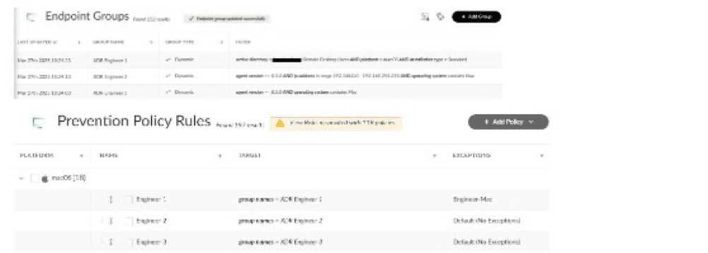 disable prevention rules attached to the Exceptions Profile "Engineer-Mac." Based on the images