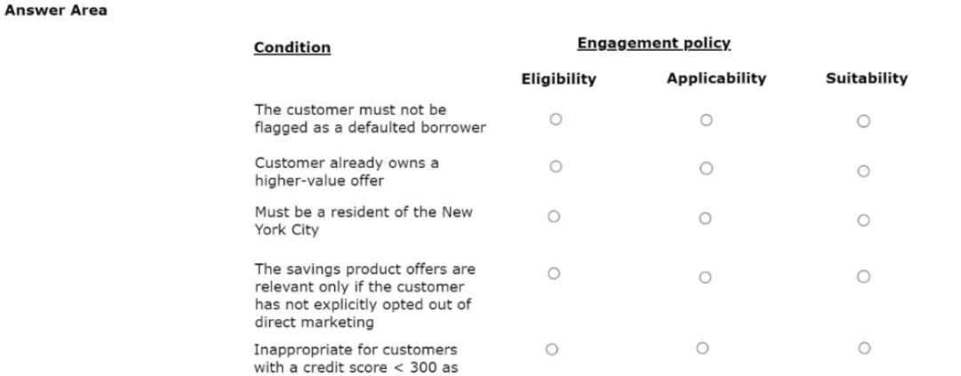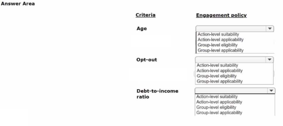 As a decisioning architect, how do you implement this requirement? In the Answer Area, select the