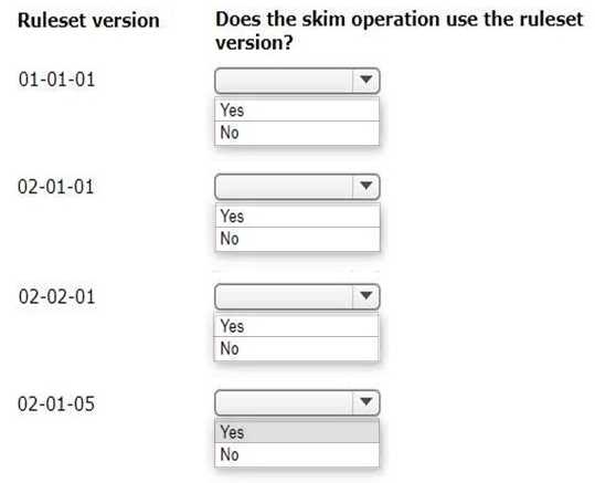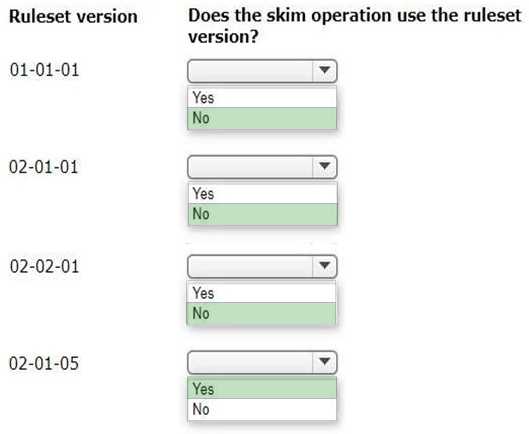 In the Answer area, select the ruleset versions that the skim operation uses.