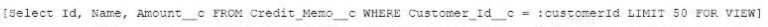 [SELECT Id, Name, Amount__c FROM Credit_Memo__c WHERE Customer_Id__c = :customerId LIMIT