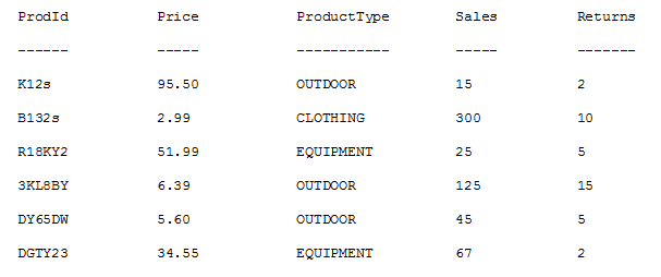 set WORK. PRODUCTS (keep=ProdId Price Sales Returns);