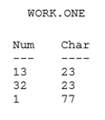 The SAS data set WORK.ONE contains a numeric variable named Num and a character variable