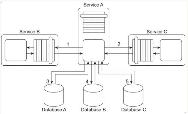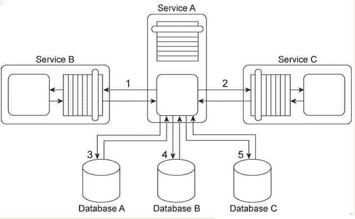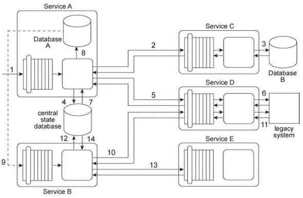 A. The State Repository pattern can be applied so that Service A writes the business document data to a separate state database until it receives a response message from Service B . If the response message contains a success code, Service A writes the business document to Database A . If the response contains a failure code, Service A discards the data that was written to the state database.