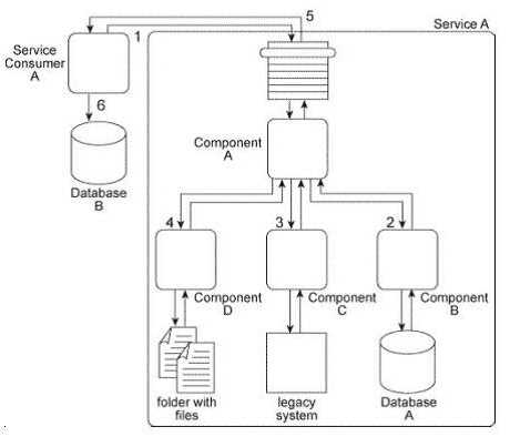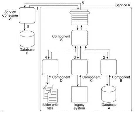 When Service A receives a message from Service Consumer A(1),the message is processed by Component A . This component first invokes Component B (2), which uses values from the message to query Database A in order to retrieve additional data. Component B then returns the additional data to Component A . Component A then invokes Component C (3), which interacts with the API of a legacy system to retrieve a new data value. Component C then returns the data value back to Component A . Next, Component A sends some of the data it has accumulated to Component D (4), which writes the data to a text file that is placed in a specific folder. Component D then waits until this file is imported into a different system via a regularly scheduled batch import. Upon completion of the import, Component D returns a success or failure code back to Component A . Component A finally sends a response to Service Consumer A (5) containing all of the data collected so far and Service Consumer A writes all of the data to Database B (6). Components A, B, C . and D belong to the Service A service architecture. Database A, the legacy system, and the file folders are shared resources within the IT enterprise. Service A is a task service that completes an entire business task on its own without having to compose other services. However, you have received many complaints about the reliability of Service A . Specifically, it has three problems. First, when Component B accesses Database A, it may not receive a response for several minutes when the database is being accessed by other applications in the IT enterprise. Secondly, the legacy system accessed by Component C frequently crashes and therefore becomes unavailable for extended periods of time. Third, for Component D to respond to Component A, it must first wait for the batch import of the files to occur. This can take several minutes during which Service Consumer A remains state ful and consumes excessive memory. What steps can be taken to address these three problems?