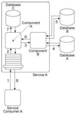 Service Consumer A sends Service A a message containing a business document (1). The business document is received by Component A, which keeps the business document in memory and forwards a copy to Component B (3). Component B first writes portions of the business document to Database A (4). Component B writes the entire business document to Database B and then uses some of the data values from the business document as query parameters to retrieve new data from Database B (5). Next, Component B returns the new data back to Component A (6), which merges it together with the original business document it has been keeping in memory and then writes the combined data to Database C (7). The Service A service capability invoked by Service Consumer A requires a synchronous request-response data exchange. Therefore, based on the outcome of the last database update, Service A returns a message with a success or failure code back to Service Consumer A (8). Databases A and B are shared and Database C is dedicated to the Service A service architecture. There are several problems with this architecture: First, the response time of Database A is often poor, resulting in Component B taking too much time to provide a response to Component A . This results in Component A consuming too many runtime resources while it holds the business document in memory and it also causes unreasonable delays in responding to Service Consumer A . Additionally, Database B is being replaced with a different database product that supports a proprietary file format. This will disable the current interaction between Component B and the new Database B . What steps can be taken to solve these problems?