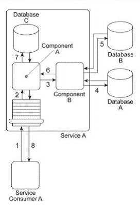 B. The Service Statelessness principle can be applied together with the State Repository pattern in order to establish a state database that Component A can defer the business document data to while it waits for a response from Component B . The Service Autonomy principle can be applied together with the Service Data Replication pattern to establish a dedicated replicated database for Component B to access instead of the shared Database A . The Asynchronous Queuing pattern can be applied to establish a messaging queue between Service Consumer A and Service A so that Service Consumer A does not need to remain stateful while it waits for a response from Service A .