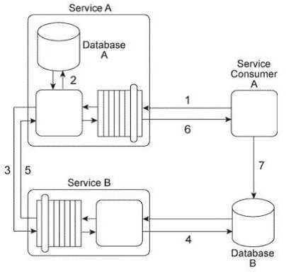 Service Consumer A sends a message with a business document to Service A (1), which writes the business document to Database A (2). Service A then forwards the business document to Service B (3), which writes the business document to Database B (4). Service B then responds to Service A with a message containing a failure or success code (5) after which Service A responds to Service Consumer A with a message containing a failure or success code (6). Upon receiving the message, Service Consumer A updates a log table in Database B (7). The log entry is comprised of the entire business document. Database A is dedicated to the Service A service architecture and Database B is a shared database. You are told that the database updates performed by Service A and Service B must be either both successful or they cannot happen at all. The database update performed by Service Consumer A must happen after it is given the outcome of the database updates performed by Service A and Service B . Given that Service Consumer A must also update Database B as part of this service composition architecture, how is it possible to fulfill these requirements?