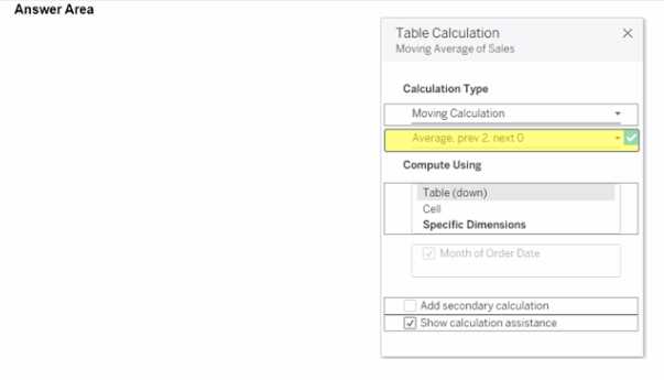 You use a quick table calculation lo calculate the moving average of a measure named Sales.