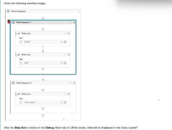 Given the following workflow image: After the Step Out is clicked on the Debug ribbon tab of UiPath Studio, what will be displayed on the Output panel?