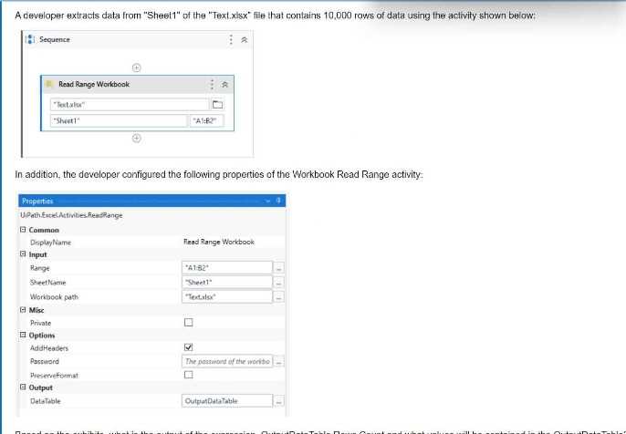 A. OutputDataTable.Rows.Count = 1 Contains the values of cells "A2" and "B2"