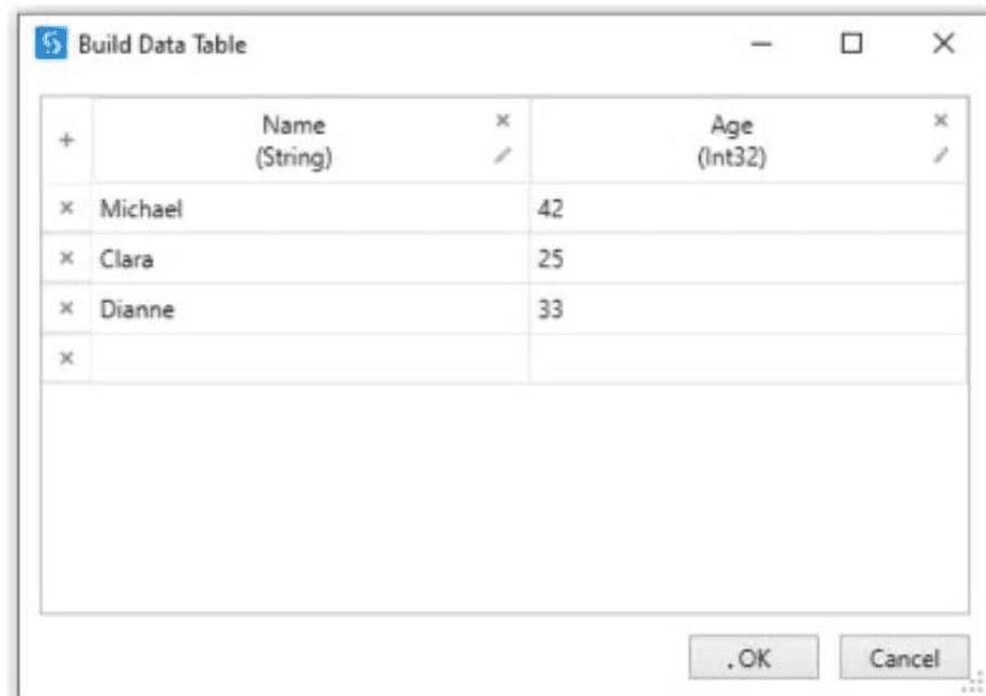 A developer created a DataTable called DT using the Build Data Table activity as shown in the exhibit. The DataTable DT contains the following data: What is the result of the expression: DT.Rows(0)(1).ToString + DT.Rows(1)(0).ToString