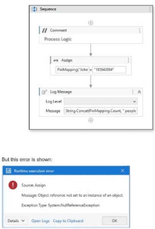 A developer needs to create a process for the Human Resources team. During the development, they try to run the workflow containing the following dictionary variable: What is the possible cause of the error in the workflow?